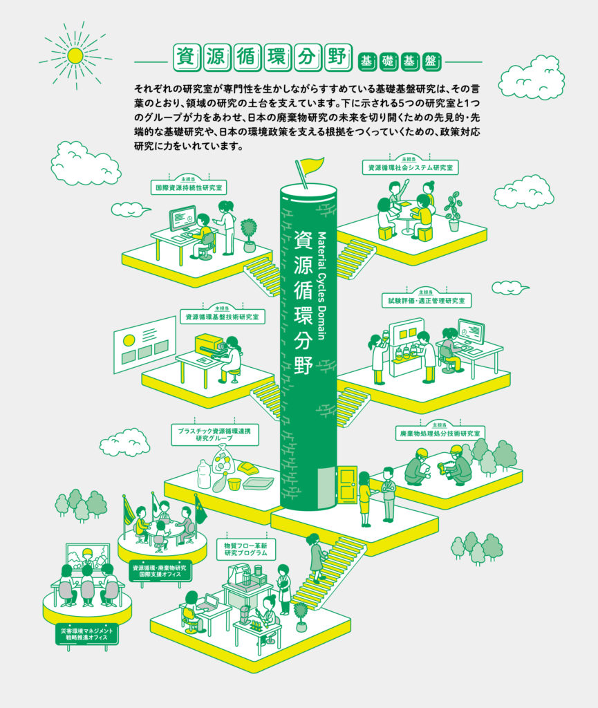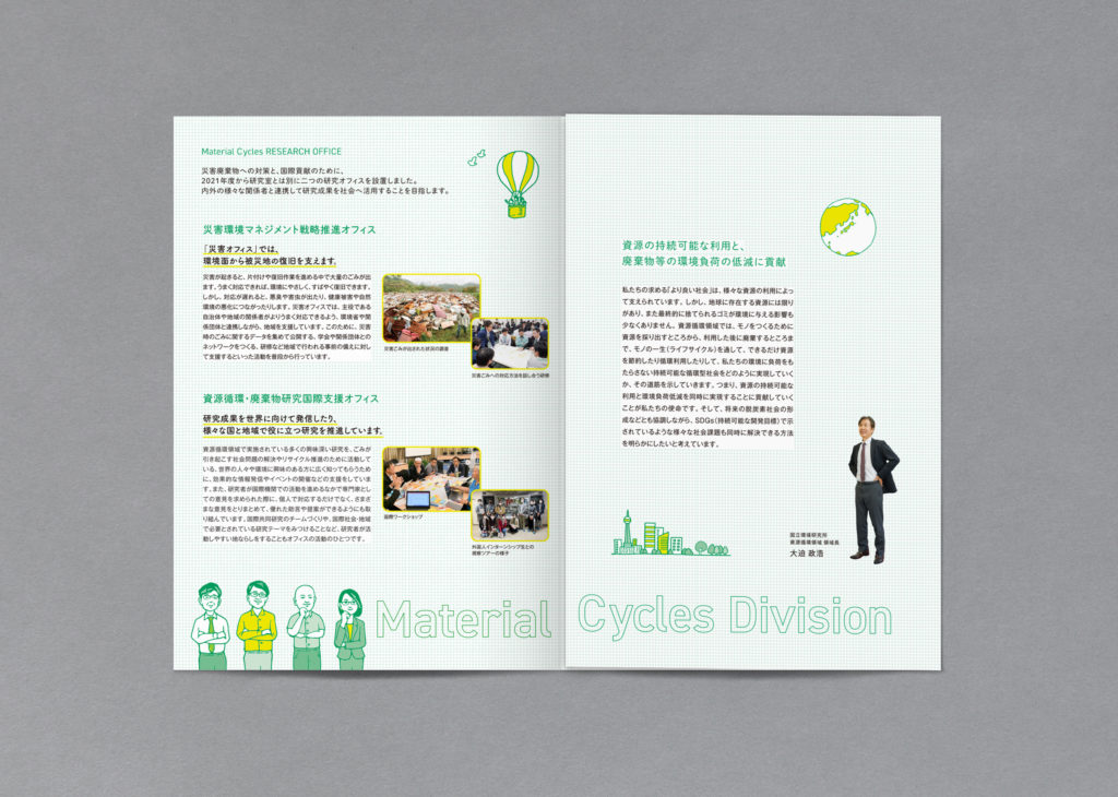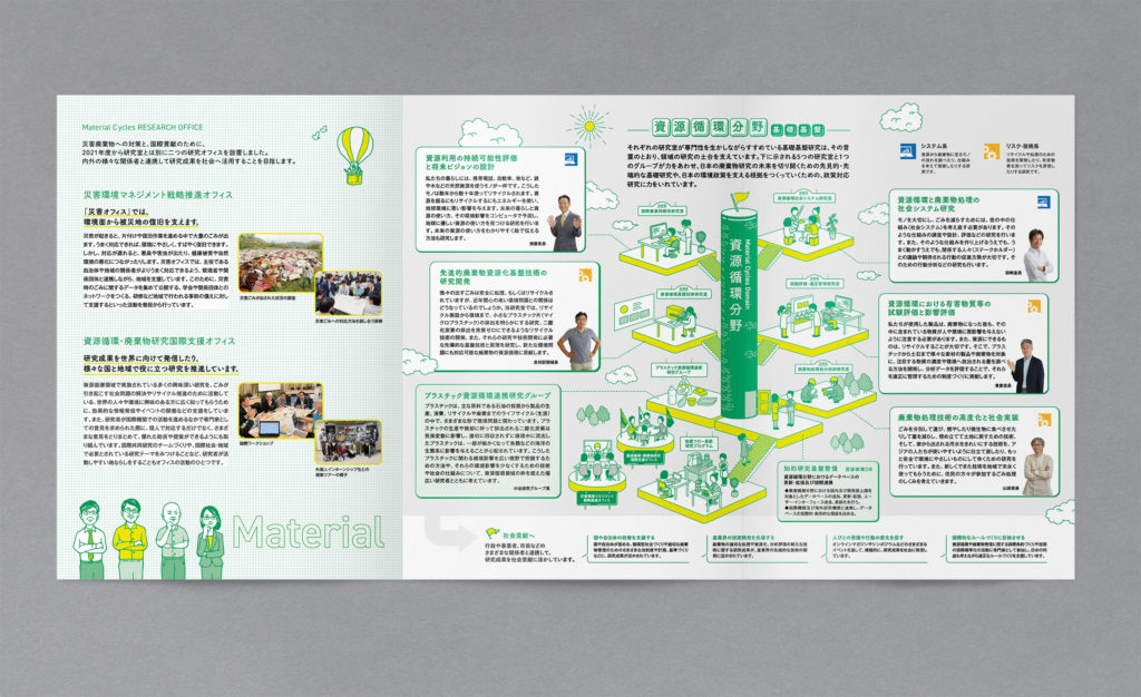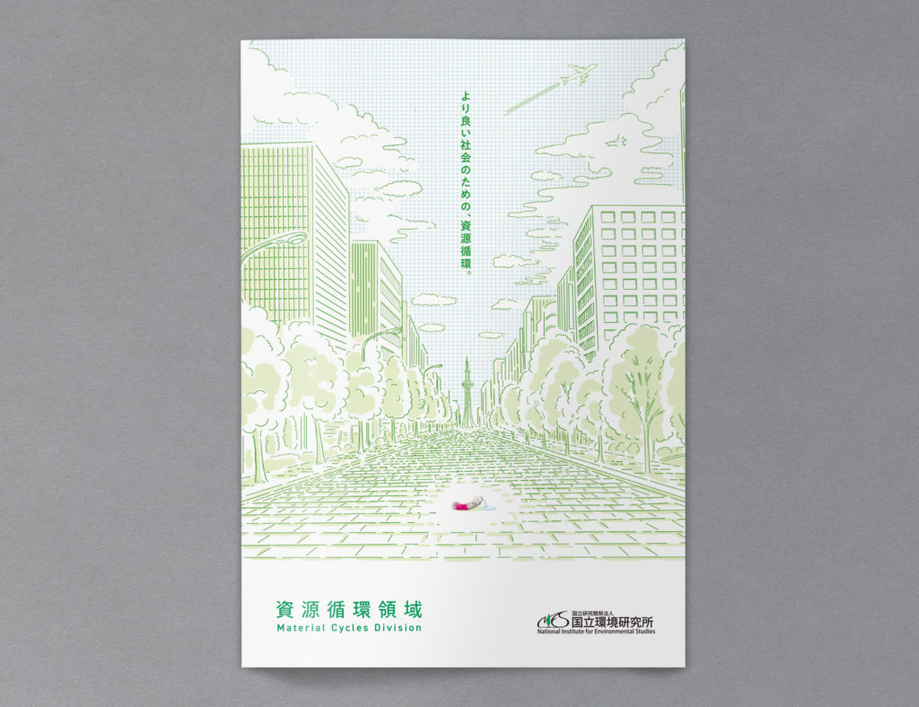 国立環境研究所の資源循環領域の活動内容を説明するパンフレット。表紙イラストの他、中面に活動内容が一目で伝わるようなイラスト図を制作。