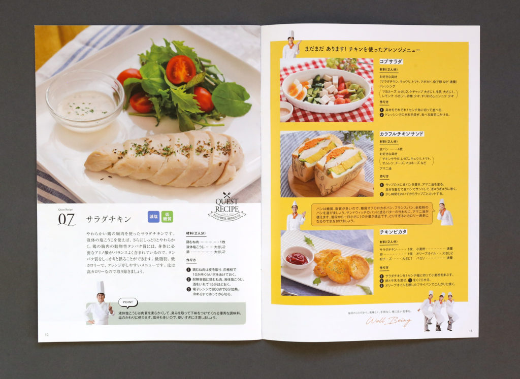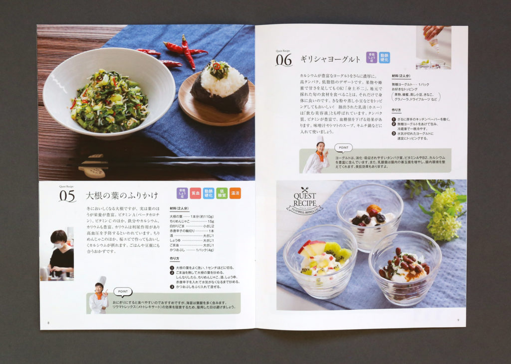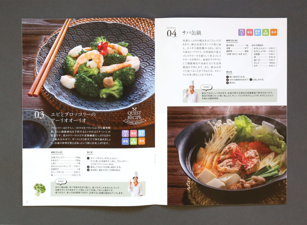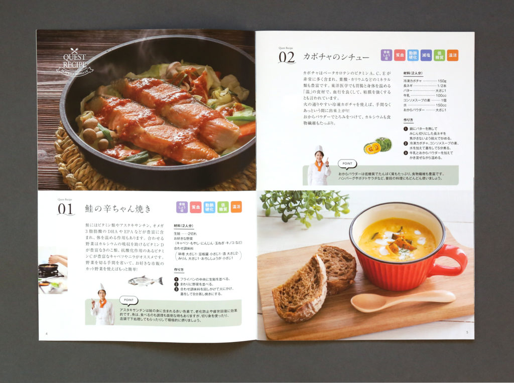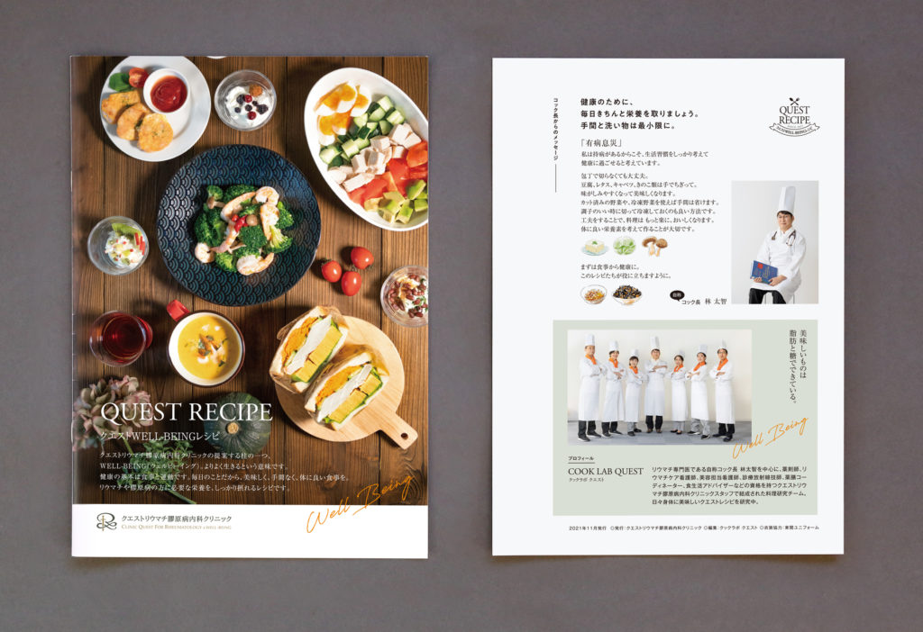 レシピ集の冊子デザイン 冊子,撮影,パンフレット ー発行 : クエストリウマチ膠原病内科クリニック編集 / フードコーディネート : 山田屋商店アートディレクション / デザイン / 挿絵イラスト : Kazuhiro Nonaka撮影 : Noriko Nonaka カテゴリー: 冊子,撮影,パンフレット chevron_left前へ 学校案内パンフレット chevron_right次へ 地域団体のロゴマーク