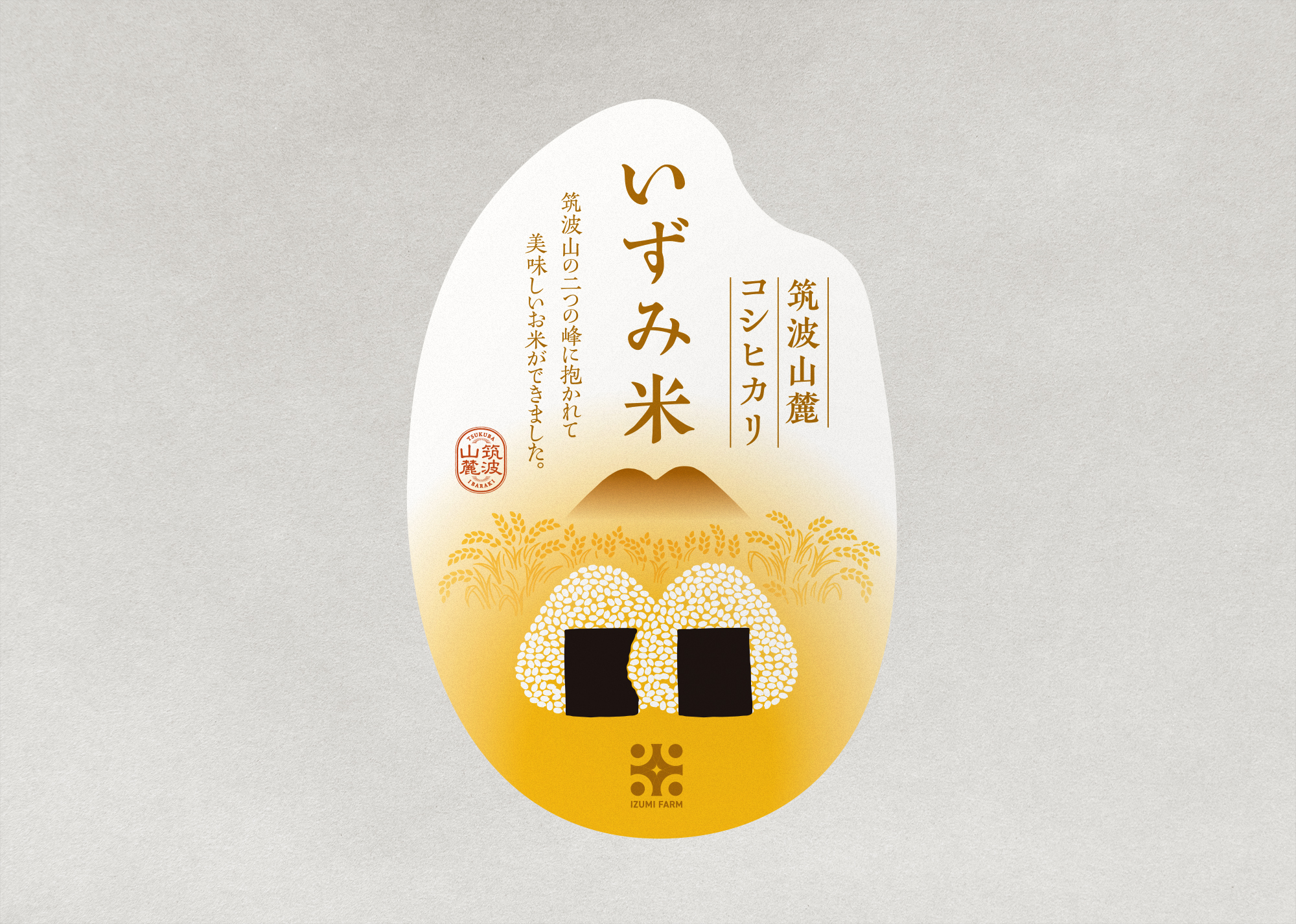 筑波山麓の田んぼでつくるお米のラベルデザイン。2つのおにぎりのシルエットで、筑波山。