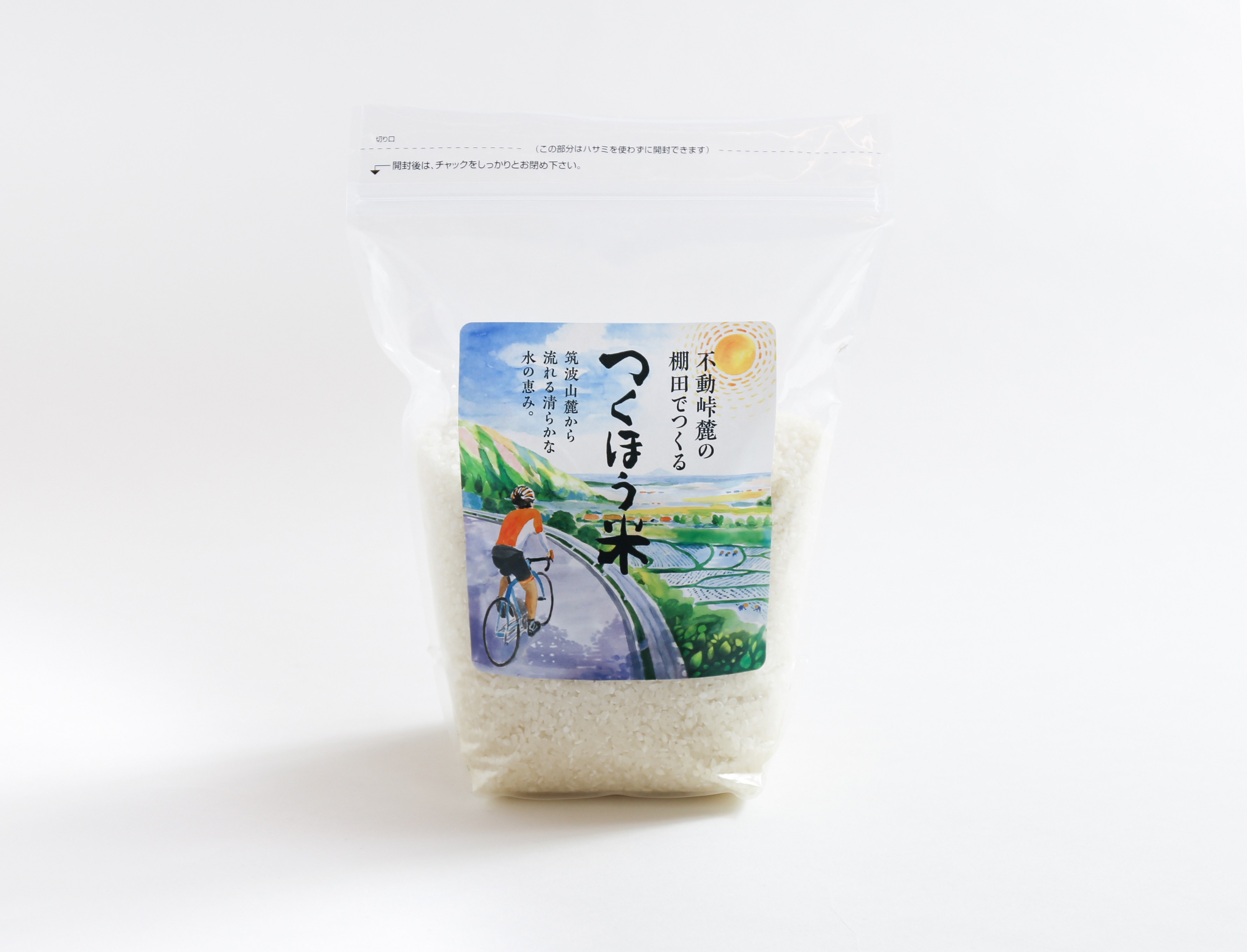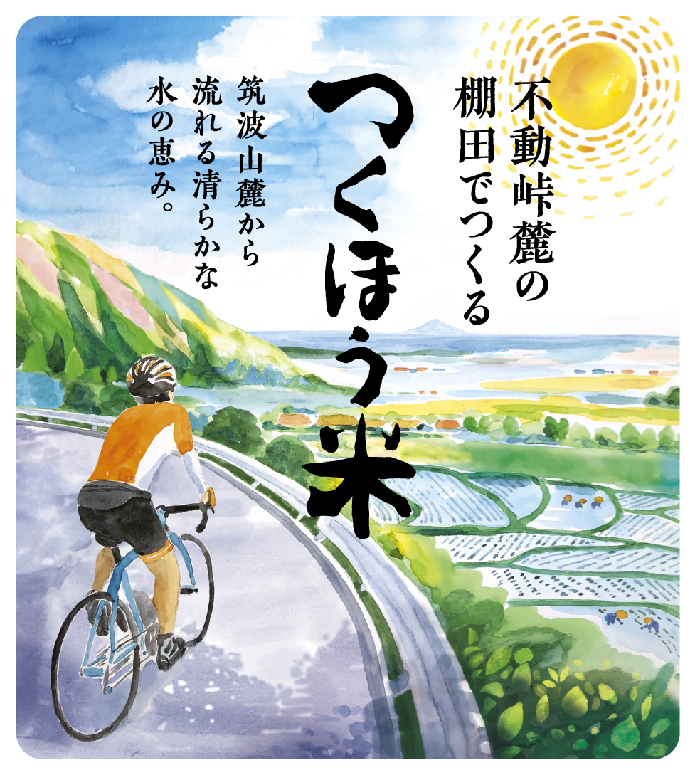 筑波山の不動峠は、週末になると、大勢のサイクリストが訪れ、ヒルクライムのメッカとして知られていて、毎年6月に開催される「ツール・ド・つくば」のコースの一部にもなっている。その峠下に広がる棚田でつくるお米のラベルデザイン。画材は、透明水彩で、峠から見える棚田と遠景に広がる関東平野を表現しました。