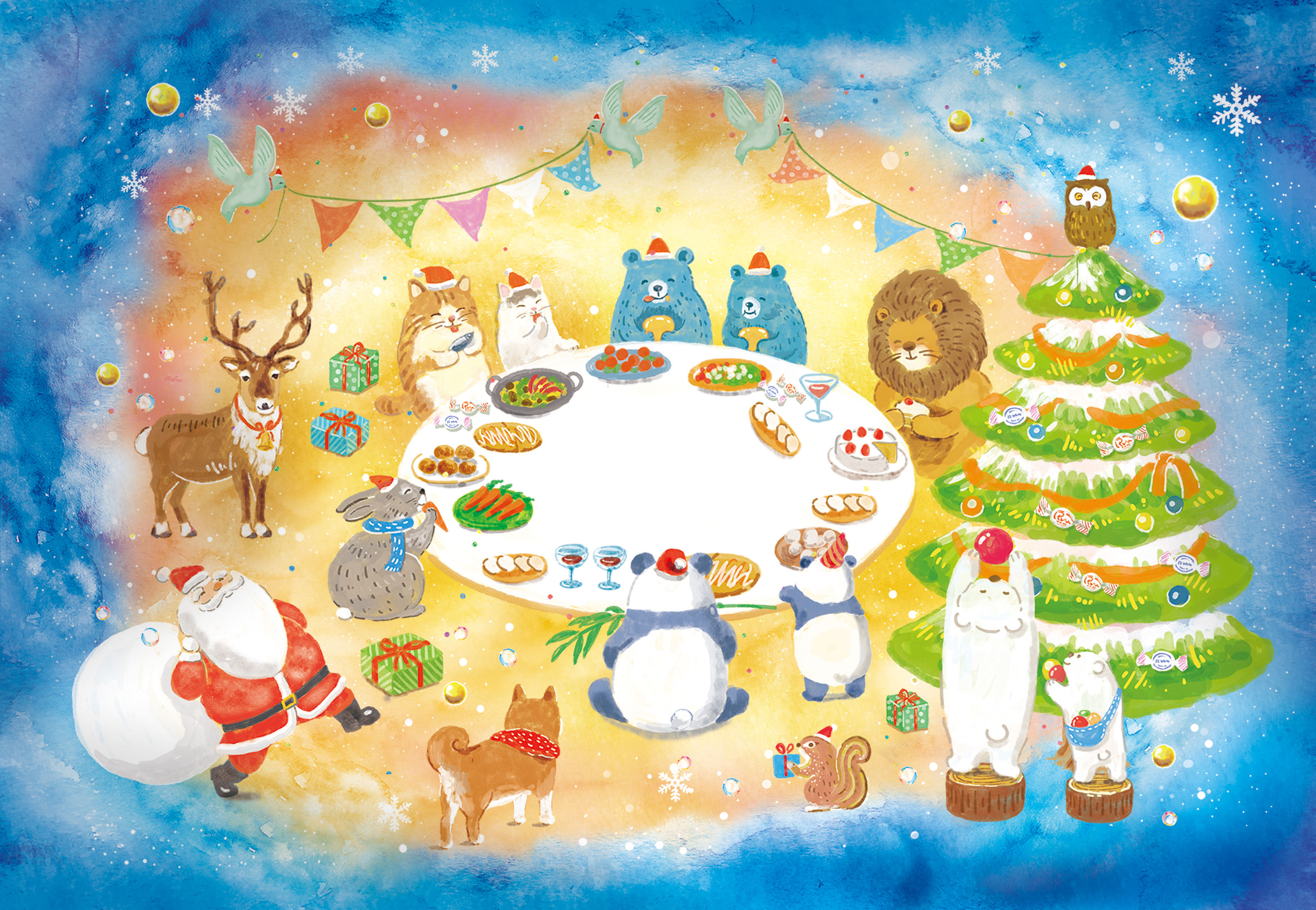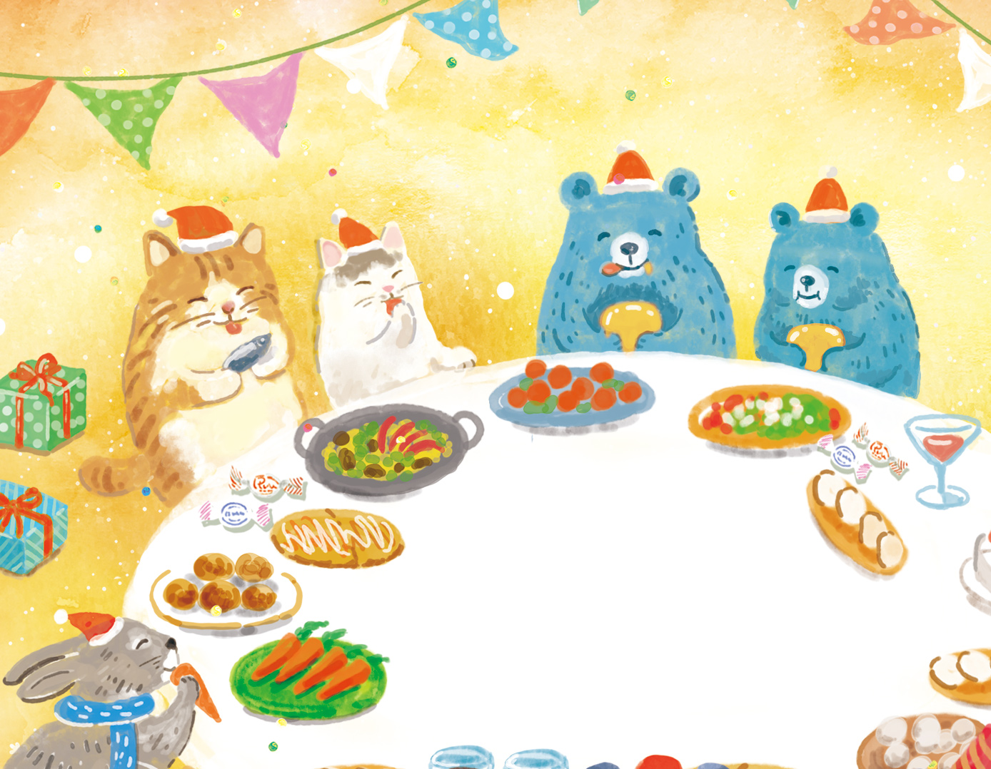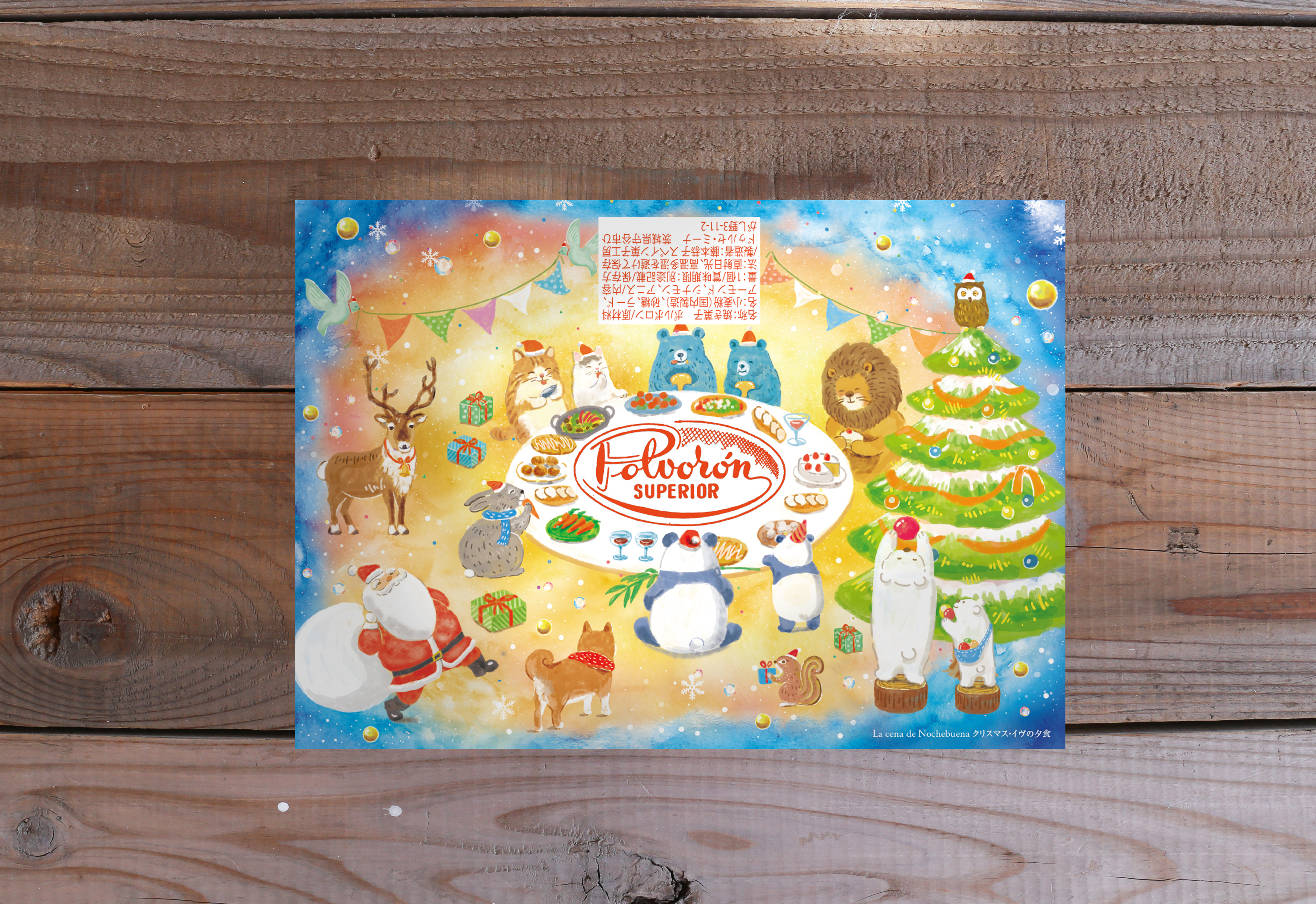 守谷の「スペイン菓子工房 ドゥルセ・ミーナ」さんの人気商品「ポルボロン」クリスマス仕様の包装紙のイラストを描きました。スペインのクリスマスは、年明けの6日ごろまで続き、家族や親戚みんなが集まって過ごすそうで、イラストでは、動物たちが集まり、楽しく食事を囲む風景を描きました。